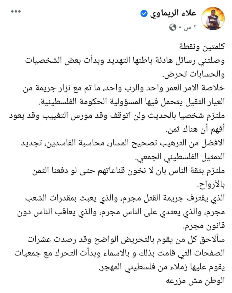 الصحفي الريماوي: تلقيت رسالة تهديد على خلفية مقتل نزار بنات