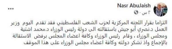 وأكد أبو جيش في تصريح نشره على صفحته في موقع (فيسبوك)، مساء اليوم الاثنين، ان اشتية وكافة أعضاء مجلس الوزراء رفضوا الاستقالة بالإجماع، موجها شكره لهم على هذا الموقف.