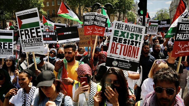 وانتقد المتظاهرون سياسة الفصل العنصري والهجمات الوحشية التي تمارسها إسرائيل، في حق المدنيين الفلسطينيين.
