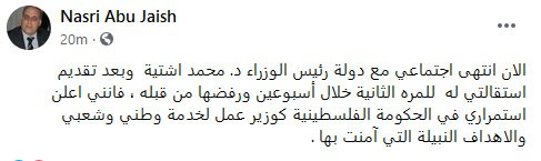 وقال أبو جيش، وفق ما جاء على صفحته على مواقع التواصل الاجتماعي، “الآن انتهى اجتماعي مع دولة رئيس الوزراء د. محمد اشتية وبعد تقديم استقالتي له للمرة الثانية خلال أسبوعين ورفضها من قبله، فإنني أعلن استمراري في الحكومة الفلسطينية كوزير عمل لخدمة وطني وشعبي والأهداف النبيلة التي آمنت بها”.