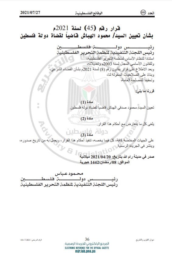 وجاء في إعلان الجريدة أنه تقرر تعيين محمود صدقي الهباش قاضيا لقضاة دولة فلسطين ويلغى كل ما يتعارض مع أحكام هذا القرار.