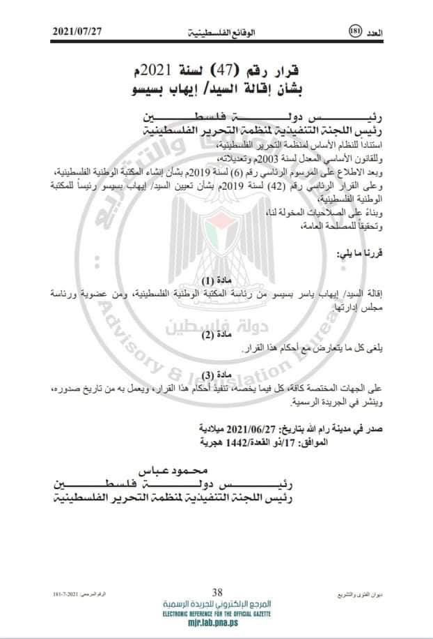 كما أعلنت جريدة الوقائع رسميا عن إقالة إيهاب بسيسو من منصب رئاسة المكتبة الوطنية الفلسطينية، ومن عضوية رئاسة مجلس الإدارة.