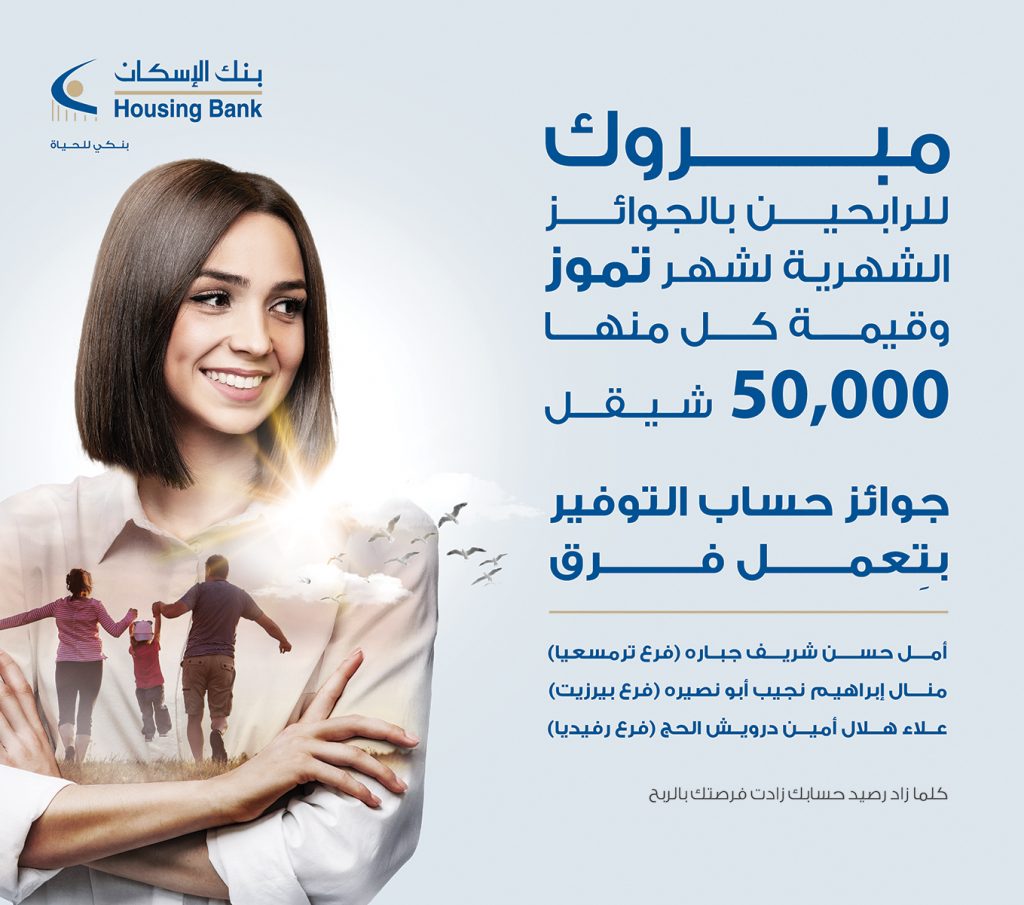 بنك الإسكان – فلسطين يعلن عن الفائزين بجوائز حسابات التوفير لشهر تموز 2021