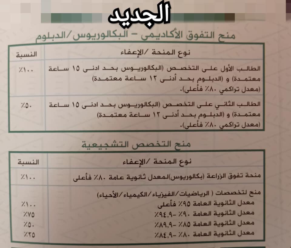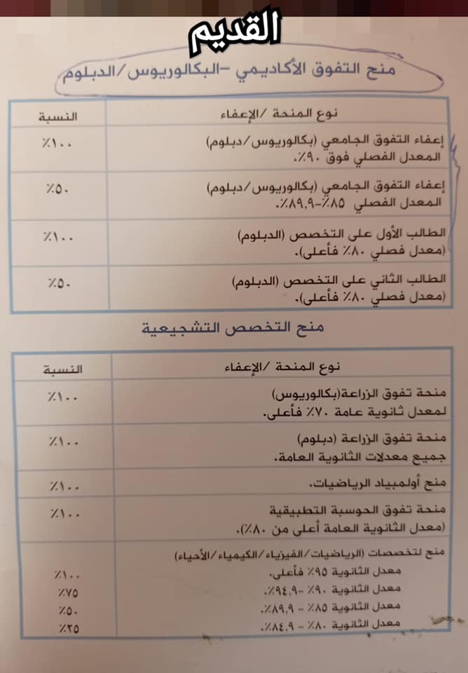 ثالثاً: ندعو ادارة الجامعة لسحب تعليماتها الجديدة من موقع الجامعة وسحب البروشور الجديد الذي تم توزيعه واعادة المنح لما كانت عليه سابقا وهي منحة المتفوقين فوق معدل (٨٥ ، ٩٠ ) ومنحة الزراعة التي تم رفع معدلها من ٧٠ الى ٨٠ ومنحة الحوسبة التطبيقيه التي تم الغاؤها.
