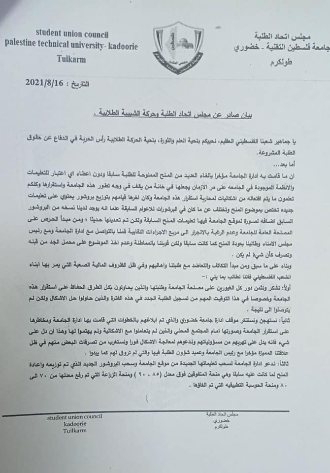 بيان صادر عن حركة الشبيبة الطلابية و مجلس اتحاد الطلبة في جامعة فلسطين التقنية خضوري .يا جماهير شعبنا الفلسطيني العظيم، نحييكم بتحية العلم والثورة، بتحية الحركة الطلابية رأس الحربة في الدفاع عن حقوق الطلبة المشروعة.أما بعد.