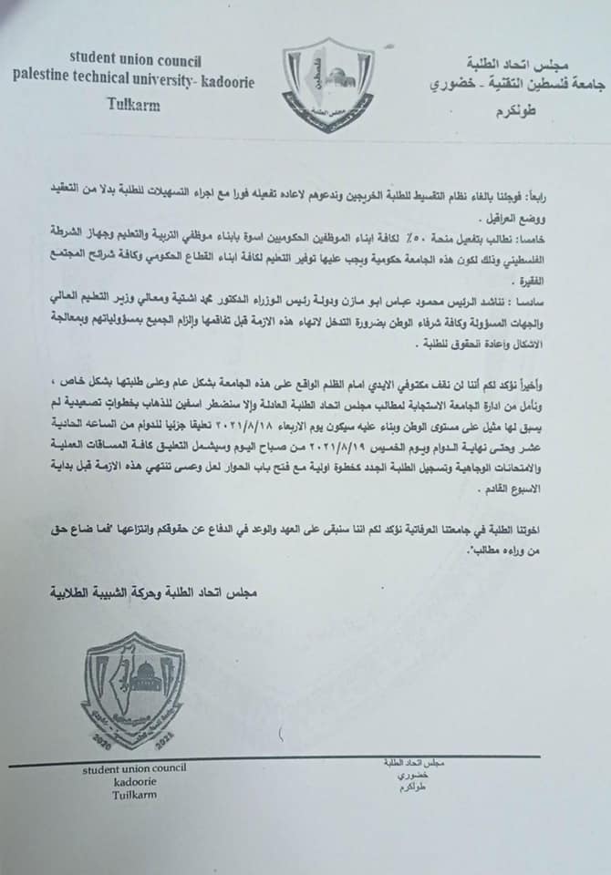 وأخيراً نؤكد لكم أننا لن نقف مكتوفي الايدي امام الظلم الواقع على هذه الجامعة بشكل عام وعلى طلبتها بشكل خاص، ونأمل من ادارة الجامعة الاستجابة لمطالب مجلس اتحاد الطلبة العادلة وإلا سنضطر اسفين للذهاب بخطواتٍ تصعيدية لم يسبق لها مثيل على مستوى الوطن وبناء عليه سيكون يوم الاربعاء ١٨/٨/٢٠٢١ تعليقا جزئيا للدوام من الساعه الحادية عشر وحتى نهاية الدوام ويوم الخميس ١٩/٨/٢٠٢١ من صباح اليوم وسيشمل التعليق كافة المساقات العملية والامتحانات الوجاهية وتسجيل الطلبة الجدد كخطوة اولية مع فتح باب الحوار لعل وعسى تنتهي هذه الازمة قبل بداية الاسبوع القادم.