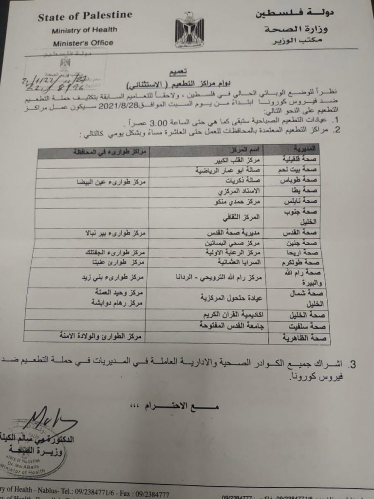 وأضافت الوزيرة الكيلة أنه نظراً للوضع الوبائي الحالي في فلسطين، ولاحقاً للتعميمات السابقة بتكثيف حملة التطعيم ضد فيروس كورونا، فسيكون العمل ابتداء من يوم السبت المقبل 28/8/2021 في مراكز التطعيم كما يلي: