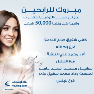 أعلن بنك الإسكان في فلسطين عن نتائج السحب على ” الجوائز الشهرية ” لجوائز حسابات التوفير لشهر آب 2021 الحالي، والتي تبلغ قيمتها 150,000 شيكل موزعة على ثلاثة فائزين بواقع 50,000 شيقل لكل فائز، حيث فاز بجوائز الشهر كل من كفى شفيق صالح اللدعة فرع رام الله مبلغ الجائزة 50,000 شيقل، آلاء محمد علي النتشة فرع الخليل مبلغ الجائزة 50,000 شيقل، وسهيل محمد أحمد عامر لمنفعة وداد محمد سهيل عامر فرع نابلس مبلغ الجائزة 50,000 شيقل.