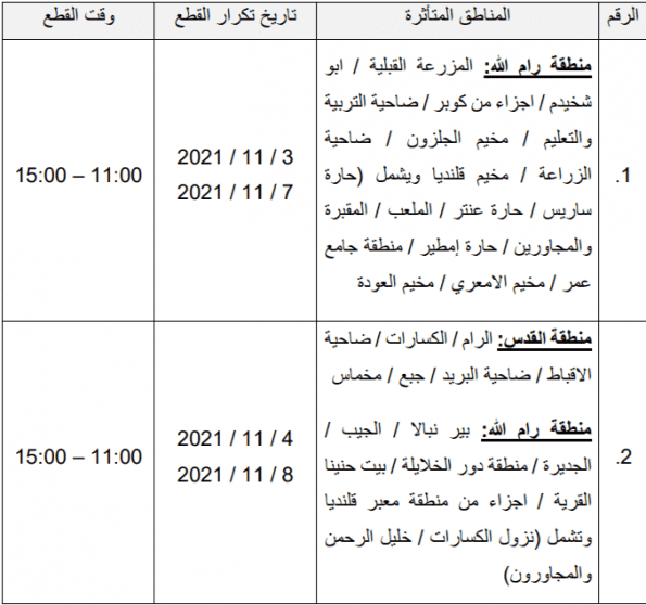 أعلنت شركة كهرباء محافظة القدس، أنه بناءا على قرار شركة كهرباء إسرائيل والمستوى السياسي لديها، فقد قررت قطع التيار الكهربائي عن عدة مناطق في أيام محددة من الساعة 11 ظهرا إلى الساعة الثالثة عصرا.