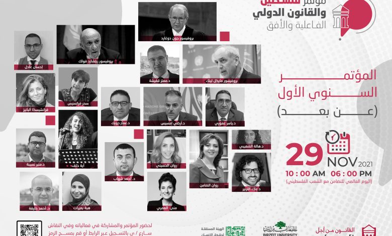 أعلنت منظمة القانون من أجل فلسطين، وبالشراكة مع كل من جامعة بيرزيت والهيئة المستقلة لحقوق الإنسان – فلسطين، عن إطلاق مؤتمر المنظمة الأول (عن بعد) بعنوان “فلسطين والقانون الدولي : الفاعلية والأفق”، والذي سوف يعقد يوم الإثنين 29 تشرين ثاني/نوفمبر 2021، في اليوم العالمي للتضامن مع الشعب الفلسطيني.