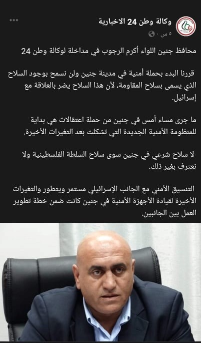 نفى اللواء أكرم الرجوب محافظ محافظة جنين تصرحيات نسبتها له “وطن 24 الاخبارية” حول سلاح المقاومة والتنسيق الامني مع الاحتلال في جنين