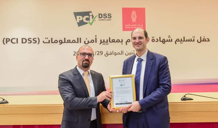 تسلّم بنك فلسطين اليوم الإثنين، شهادة الالتزام بمعايير أمن المعلومات وبيانات بطاقات الدفع الإلكترونية (PCI DSS)، من مجلس حماية وأمن بطاقات الدفع العالمي ومقرّها في الولايات المتحدة الأمريكية، وذلك كأول مؤسسة مصرفية فلسطينية تحصل على هذه الشهادة منذ العام 2018.