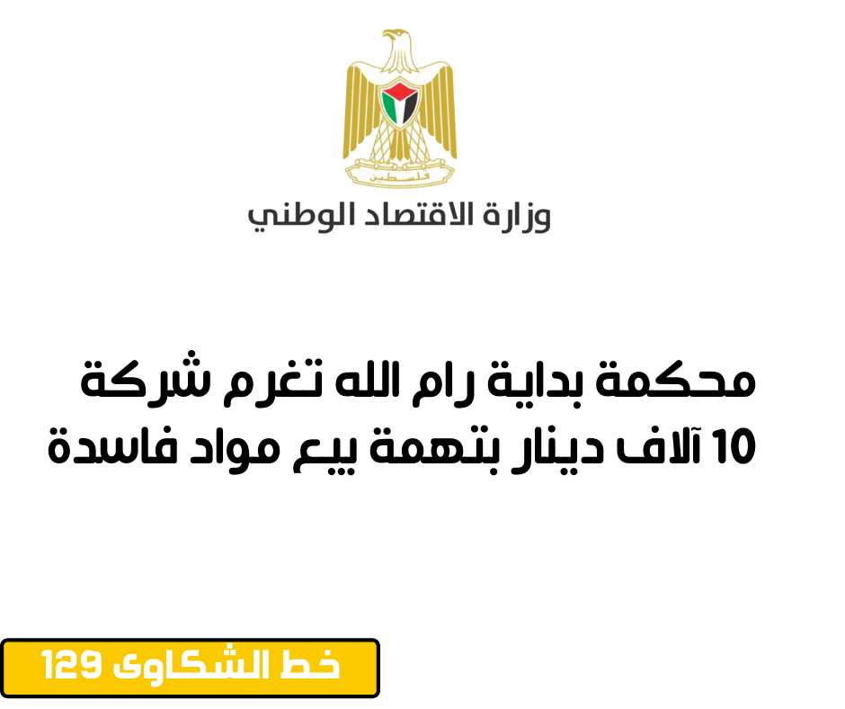 أصدرت محكمة بداية رام الله ممثلة بهيئة القاضي بسام زيد، حكماً بإدانة شركة (ك،أ) للمواد الغذائية، بالغرامة 10 آلاف دينار أردني، لعرض أو بيع او تداول سلع غذائية فاسدة او منتهية الصلاحية سنداً لأحكام المادة 1/2 من القرار بقانون رقم27 لسنة 2018 بشأن حماية المستهلك.