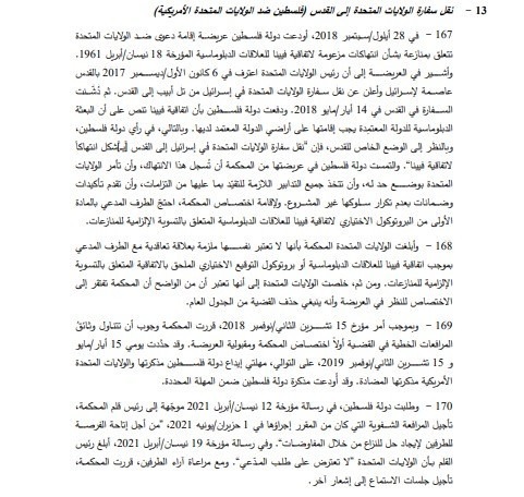 وجاء بدعوى السلطة التي تقدمت بها في 28 أيلول/ سبتمبر 2018، أن الولايات المتحدة الأمريكية انتهكت اتفاقيات فيينا للعلاقات الدبلوماسية المؤرخة في 18 نيسان/ أبريل 1961، من خلال نقل سفارتها إلى القدس، والاعتراف بها كعاصمة لدولة الاحتلال الإسرائيلي.