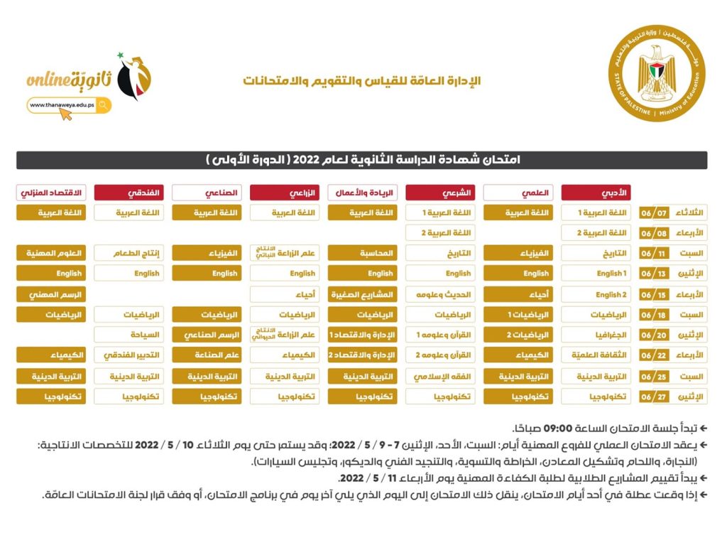 نشرت الإدارة العامة للقياس والتقويم والامتحانات في وزارة التربية والتعليم، مساء الثلاثاء، برنامج امتحان الثانوية العامة 2022 الدورة الأولى.