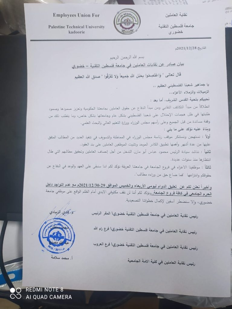 أعلنت نقابات العاملين في جامعة فلسطين التقنية- خضوري وفي كلية الأمة الجامعية، تعليق الدوام ليومي الأربعاء والخميس 29-30/12/2021، احتجاجا على ما وصفته بالمماطلة في استجابة الحكومة لمالبهم.