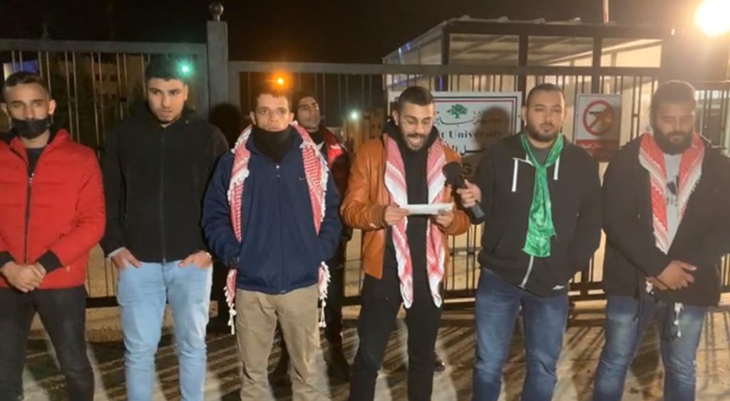وقال ممثل القطب الطلابي، أحمد خاروف، إن “إدارة الجامعة تصر على تشكيل لجنة نظام بحق ممثل الكتلة الإسلامية والقطب الطلابي، وهم يرفضون بدورهم الخضوع لهذه اللجنة حيث ستحاسبهم على قضايا وطنية”.