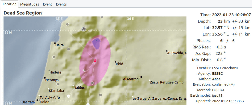 وأشارت الوحدة أن زلزالاً حصل ظهراً حسب التوقيت المحلي لفلسطين اليوم، وكان بقوة 3.8 على مقياس ريختر وعلى عمق 23 كم في باطن الأرض على خط عرض 32.57 شمالا وخط طول 35.56 شرقا (النتائج أولية يمكن التعديل عليها لاحقا) حسب مركز رصد الزلازال الفلسطيني في جامعة النجاح جنوب.تبعد هذه البؤرة 13 كم تقريبا جنوب البؤرة الزلزالية للهزة الارضية التي حصلت البارح يوم السبت مساء.تبعد بؤرة الزلزال 50 كم شمال – شرق مدينة نابلس وتبعد 20 كم شمال – شرق مدينة جنين.