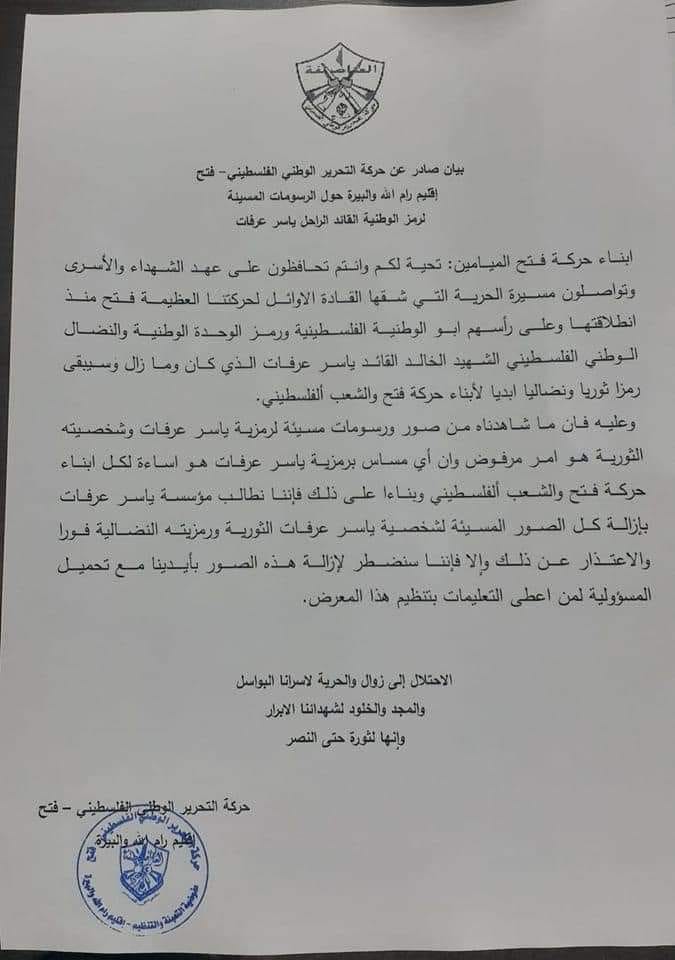 يتوجه متحف ياسر عرفات إلى جميع مُتابعيه وزواره، بأن ما يتم عرضه من رسمات كاريكاتيرية في معرض (فلسطين وياسر عرفات) خضعت إلى نقاش وفحص، وعلى ذلك سُمح بنشر تلك الرسومات، كما أنه لم يتم نشر رسومات فيها جدل ديني أو عرقي.