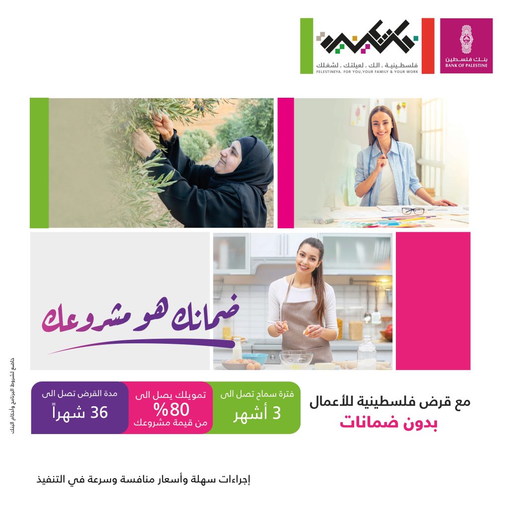 أعاد بنك فلسطين إطلاق “قرض فلسطينية للأعمال بدون ضمانات” لدعم وتمويل المشاريع الخاصة بسيدات الأعمال تحت شعار “ضمانك هو مشروعك”، ولتلبية احتياجاتهن المالية والمصرفية الشاملة، وذلك من خلال الحصول على التمويل اللازم بدون أية ضمانات وبشروط بسيطة وميسرة.