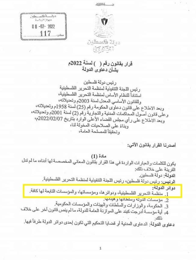 صرح المستشار القانوني لرئيس الدولة بأنه وفي ضوء سوء الفهم الذي تناقلته مواقع التواصل الاجتماعي لبعض العبارات الواردة في القرار بقانون بشأن دعاوى الدولة غير المنشور في الجريدة الرسمية وغير النافذ، فقد أعاد سيادة رئيس الدولة إصدار القرار بقانون من جديد، بعد توضيح وإعادة صياغة العبارة الملتبسة، على نحو اعتبرت فيه دعاوى منظمة التحرير الفلسطينية في حكم دعاوى الدولة وتعامل معاملتها، على أن يصار لنشره في الجريدة الرسمية حسب الأصول.