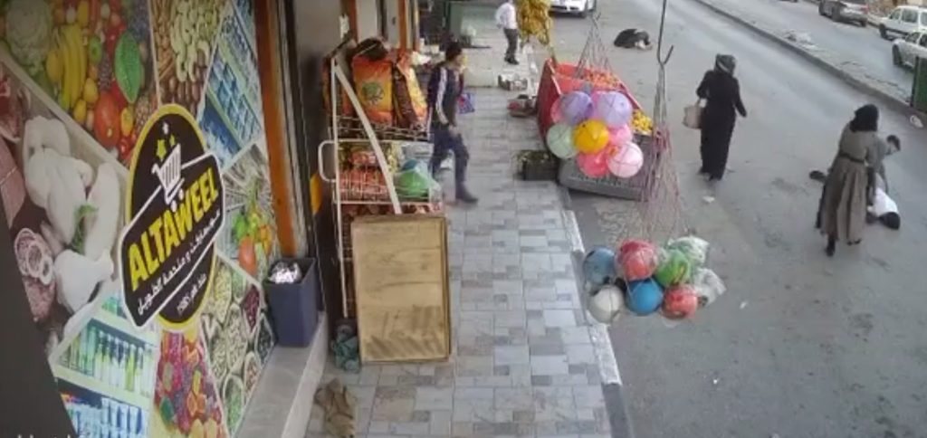 ويظهر في فيديو لكاميرا مراقبة، قيام سائق الدراجة النارية بدهس مواطن، ومن ثم فقد السيطرة على الدراجة وانقلبت على الشارع، حيث اصيب السائق وشاب يركب خلفه، اضافة للمواطن الذي تم دهسه