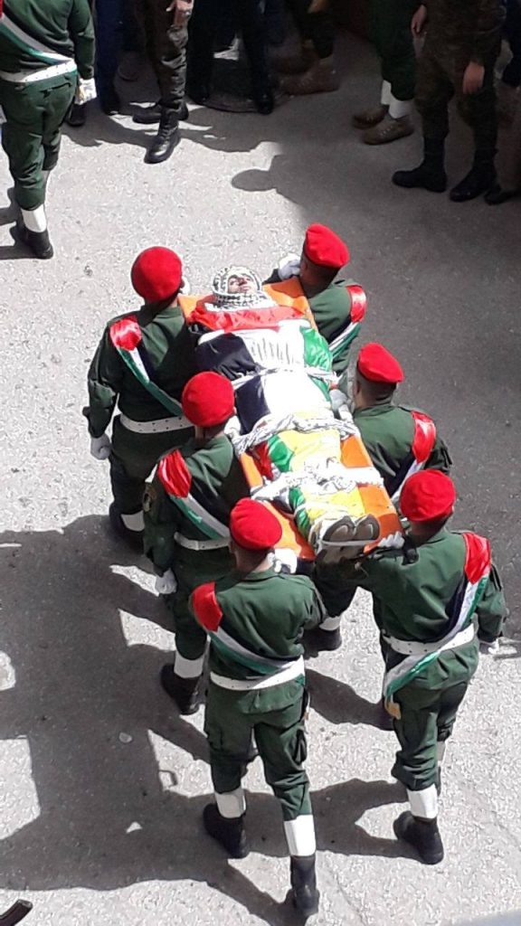وانطلق موكب التشييع من أمام مستشفى بيت جالا الحكومي، الى منزل عائلته في بلدة الخضر، حيث القي على جثمانه نظرة الوداع الأخيرة، لينقل إلى مسجد الخضر الكبير للصلاة عليه ثم الى مقبرة الشهداء.