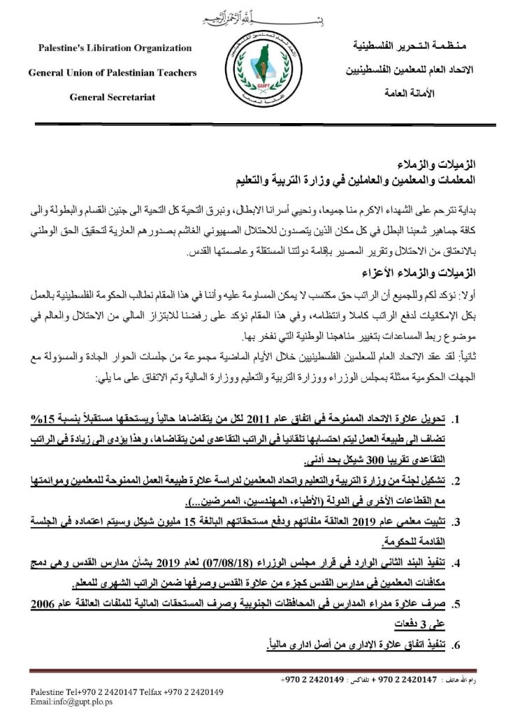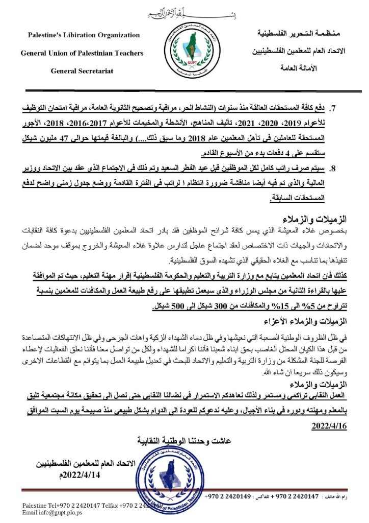 وللمسجد الاقصى العتيق  فاننا نعلن تعليق فعاليات الاتحاد لاعطاء الوقت الفرصة للجنة المشكلة من وزارة التربية والتعليم ومكتب رئيس الوزراء  واتحاد المعلمين لتعديل طبيعة العمل لتتوائم مع القطاعات الاخرى  والتي ستبدا اعمالها يوم الاحد ١٧/٤/٢٠٢٢.