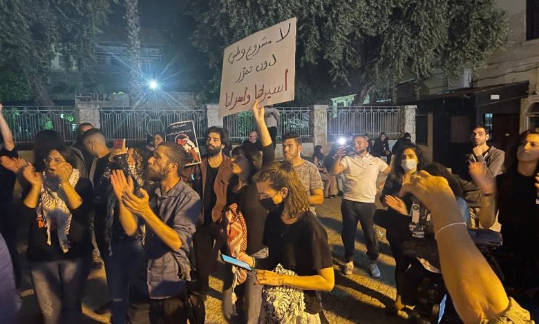 وهتف المشاركون للقدس والمسجد الأقصى ومنطقة باب العمود، وضد اعتداءات الاحتلال على المصلين في المسجد، ورفعوا لافتات كُتب على بعضها شعارات من قبيل: “لا مشروع وطني دون تحرر”، و”لا عدالة لديكم”، و”دولة فصل عنصري”، و”نثور من أجل الحرية”.