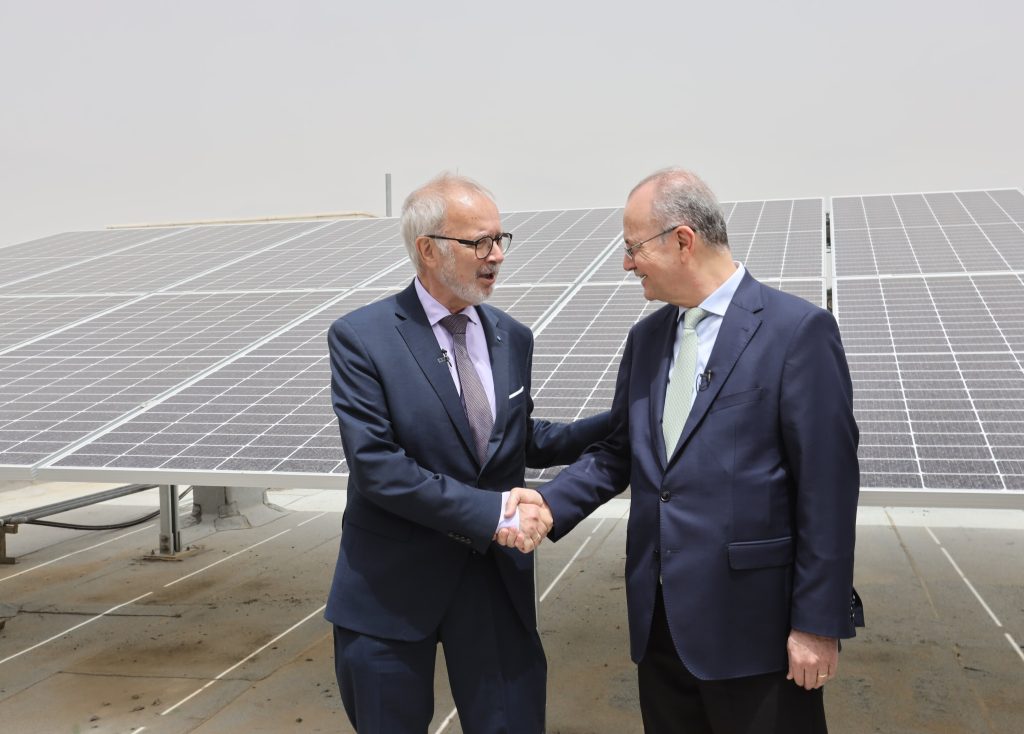 تفقّد كلّ من الدكتور محمد مصطفى، رئيس مجلس إدارة صندوق الاستثمار الفلسطيني، والسيد فيرنر هوير رئيس بنك الاستثمار الأوروبي، برنامج الطاقة الشمسية على أسطح المدارس، والذي ينفذه الصندوق بالشراكة مع وزارة التربية والتعليم، وشركات توزيع الكهرباء.