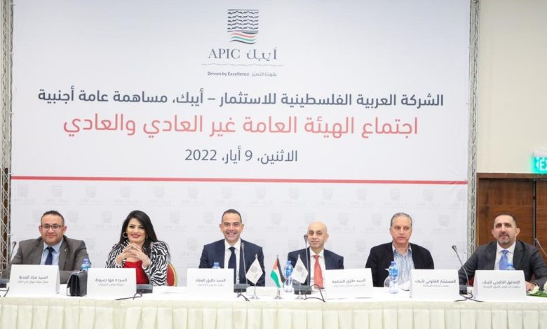 عقدت الشركة العربية الفلسطينية للاستثمار- أيبك، يوم الاثنين الموافق 9 أيار، 2022 اجتماع هيئة عامة غير عادي وعادي في مدينة رام الله، فلسطين برئاسة السيد طارق العقاد، رئيس مجلس إدارة الشركة ورئيسها التنفيذي وبحضور أعضاء مجلس إدارة أيبك وممثلين عن وزراة الاقتصاد الوطني- مكتب مراقب الشركات، وهيئة سوق رأس المال الفلسطينية، وبورصة فلسطين، إضافة إلى مدقق الحسابات الخارجي والمستشار القانوني لأيبك وحشد من مساهمي الشركة.