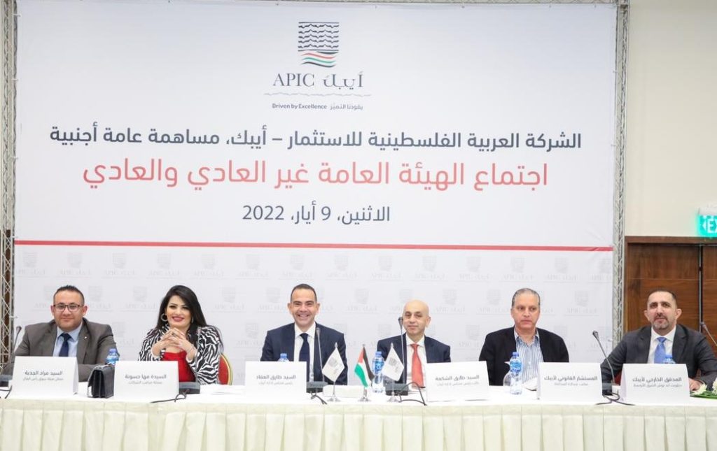 عقدت الشركة العربية الفلسطينية للاستثمار- أيبك، يوم الاثنين الموافق 9 أيار، 2022 اجتماع هيئة عامة غير عادي وعادي في مدينة رام الله، فلسطين برئاسة السيد طارق العقاد، رئيس مجلس إدارة الشركة ورئيسها التنفيذي وبحضور أعضاء مجلس إدارة أيبك وممثلين عن وزراة الاقتصاد الوطني- مكتب مراقب الشركات، وهيئة سوق رأس المال الفلسطينية، وبورصة فلسطين، إضافة إلى مدقق الحسابات الخارجي والمستشار القانوني لأيبك وحشد من مساهمي الشركة.