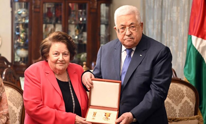 منح رئيس دولة فلسطين محمود عباس، السيدة وداد قعوار، ميدالية الإنجاز من وسام الرئيس محمود عباس.
