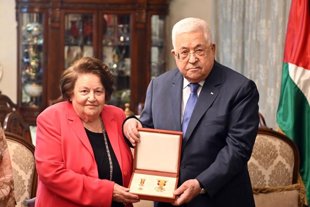 منح رئيس دولة فلسطين محمود عباس، السيدة وداد قعوار، ميدالية الإنجاز من وسام الرئيس محمود عباس.