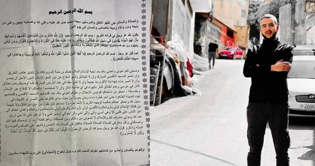 تلفزيون الفجر | تداول فلسطينيون، اليوم الجمعة 17 يونيو 2022، وصية وجدوها بين ملابس الشهيد براء كمال لحلوح، الذي ارتقى فجراً مع المقاومين ليث أبو سرور، ويوسف صلاح، في عملية اغتيال نفذتها قوات الاحتلال في الحي الشرقي بمدينة جنين شمالي الضفة الغربية المحتلة.