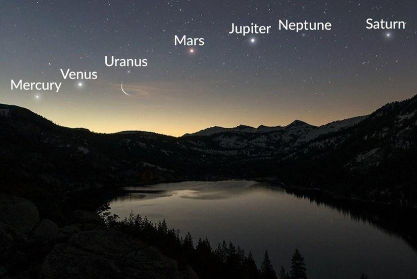 وستمتد الكواكب الخمسة من الشرق إلى الجنوب عبر السماء، وهناك مكافأة إضافية لكم، وهي الهلال ، حيث يسطع بين كوكب الزهرة والمريخ، وسيكون بعيدًا قليلاً عن خط الكواكب، حيث يسافر من كوكب إلى كوكب خلال النصف الأخير من شهر يونيو.