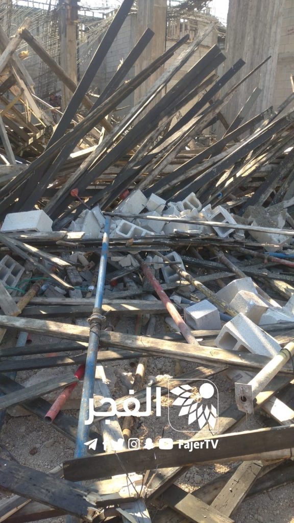 ذكر الطاقم أنه تم إخلاء العمال الذين كانوا عالقين على سقف المبنى قيد الإنشاء بعد إنهياره أثناء تسليحه بالباطون وتأمينهم في محيط ورشة البناء وتسليمهم لطواقم الإسعاف .