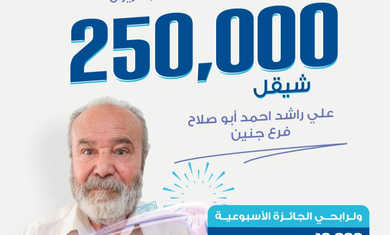 أعلن بنك الإسكان في فلسطين عن نتائج السحب على ” الجوائز النصف سنوية ” لجوائز حسابات التوفير 2022 الحالي، والتي تبلغ قيمة الجائزة الكبرى فيها 250,000 شيقل لرابح واحد بحيث فاز بها السيد علي راشد احمد أبو صلاح من فرع جنين، وجوائز أسبوعية قيمة كل منها 10,000 شيقل فازت بها في الأسبوع الأول ابتهاج ابراهيم محمد مرعب من فرع حلحول، وفي الأسبوع الثاني عصام عبد الرحمن محمد عوض من فرع رام الله، وفي الأسبوع الثالث حسن عثمان مصطفى أبو كلوسه من فرع خان يونس، إضافة الى 10 فائزين بجوائز ترضية قيمة كل منها 5,000 شيقل في مختلف المحافظات.