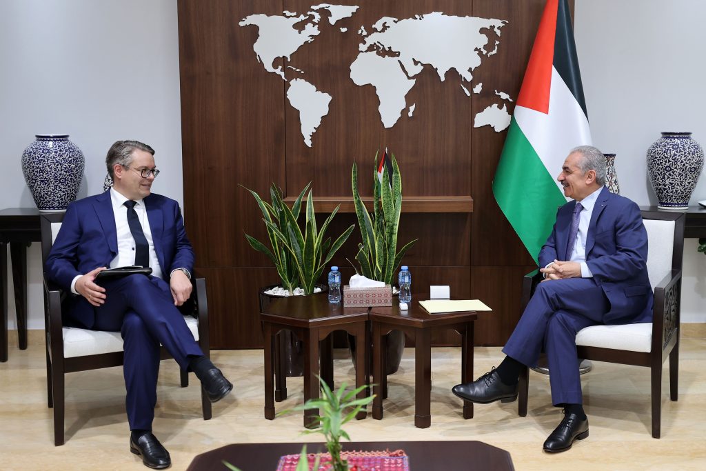 طالب رئيس الوزراء محمد اشتية جمهورية ألمانيا الاتحادية بالاعتراف بدولة فلسطين، وذلك من منطلق إيمانها بحل الدولتين وأهمية الحفاظ عليه، ولمواجهة كافة الإجراءات الإسرائيلية التي تهدف الى تدميره، خاصة مصادرة الأراضي لصالح التوسع الاستيطاني الذي يدمر أي فرصة لإقامة دولة فلسطين على حدود عام 1967 متواصلة جغرافيا وقابلة للحياة وعاصمتها القدس.