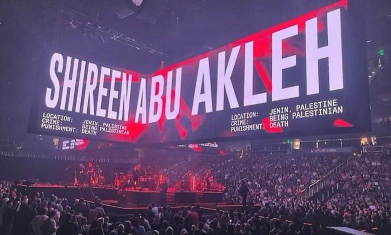 وكُتب على شاشة العرض الضخمة خلف الفرقة، “شيرين قتلت لأنها كانت فلسطينية”.