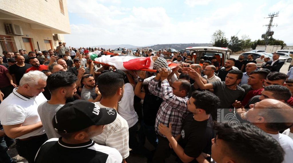 وحمل المشيعون جثمان الشهيد على الأكتاف في مسيرة انطلقت من أمام مستشفى طوباس التركي الحكومي، بعد وصول جثمانه من مدينة جنين.