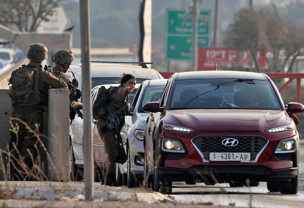 Members of the Israeli security forces check cars at the Huwara checkpoint near the West Bank city of Nablus on October 12, 2022, a day after an Israeli soldier was shot and killed near a settlement in an attack claimed by Palestinian militants. Violence has surged in recent months in the Israeli-Palestinian conflict, amid near daily West Bank raids and an uptick in attacks on Israeli troops. (Photo by JAAFAR ASHTIYEH / AFP)