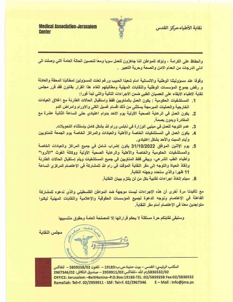 وأعلنت النقابة أن يوم الإثنين المقبل إضراب شامل في كافة المراكز والعيادات الخاصة والمشافي الحكومية والأهلية والرعاية الصحية وعيادات وكالة الغوث (أونروا)، وأطباء الطب الشرعي، على أن يبقى فقط المناوبين في جميع المستشفيات ويتم استقبال الحالات الطارئة وإنقاذ الحياة.