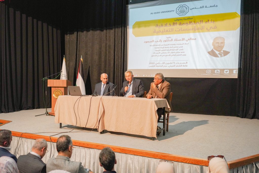 قدم أستاذ السياسات والقيادة التربوية في الجامعة الأردنية أ.د. راتب السعود محاضرةً عامة في جامعة القدس- الحرم الرئيس، حول “بناء المنظومة الأخلاقية في المؤسسات التعليمية”، أثناء زيارته إلى الجامعة تحت رعاية رئيسها أ.د. عماد أبو كشك.