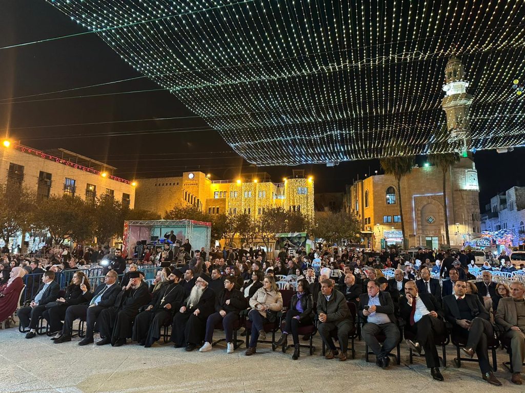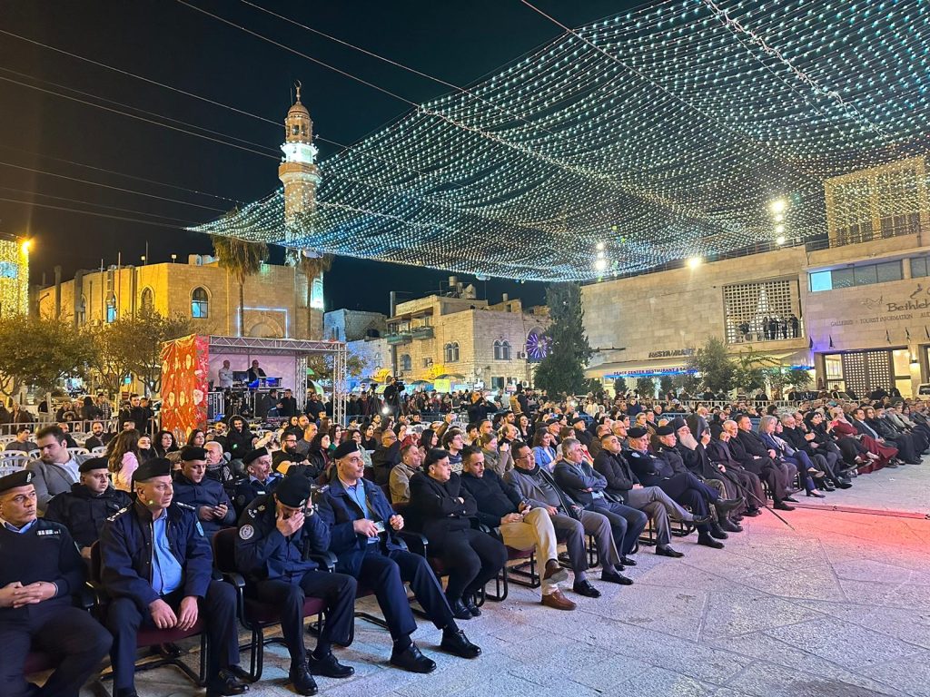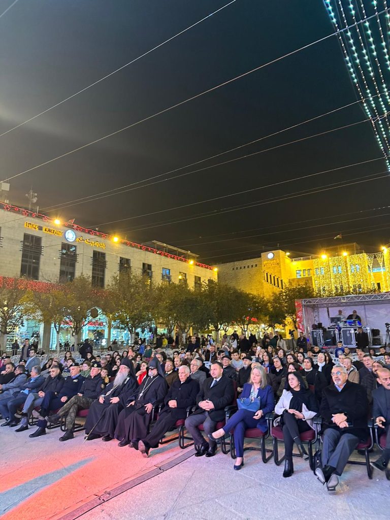 ابتدء الحفل بالنشيد الوطني الفلسطيني بعزف من معهد ادوارد سعيد الوطني للموسيقى، وتلاه عرض يعكس لوحة فنية بعنوان “أجراس بيت لحم” بتقديم من مسرح ديار.