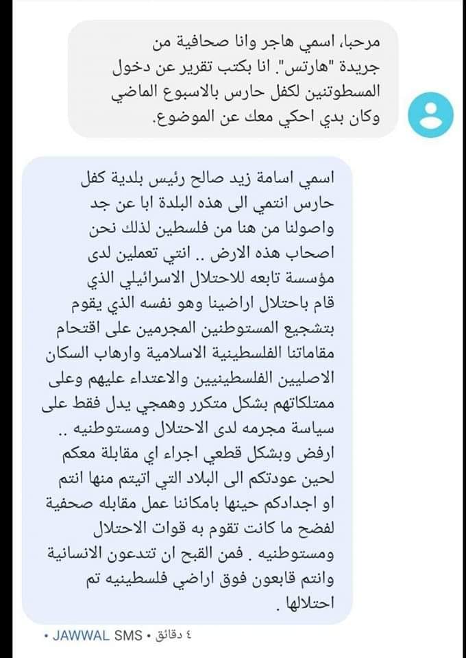تلقى رئيس بلدية كفل حارس قضاء سلفيت أسامة زيد طلباً من صحفية اسرائيلية تعمل لدى جريدة “هآرتس” لإجراء مقابلة معه حول اقتاحامات المستوطنين للقرية.