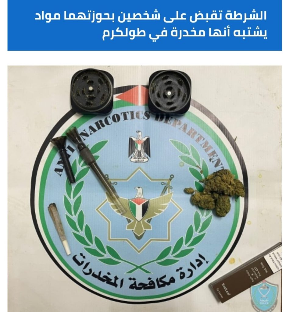 وذكرت إدارة العلاقات العامة والإعلام في الشرطة أنه وبناء على معلومات وردت لفرع مكافحة المخدرات في شرطة المحافظة مفادها وجود شخصين من خارج المحافظة بحوزتهما مواد يشتبه أنها مخدرة داخل مدينة طولكرم .