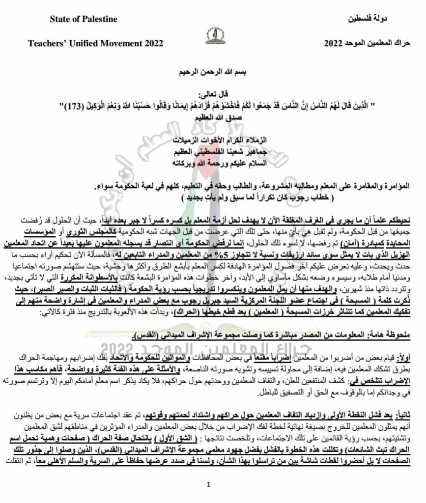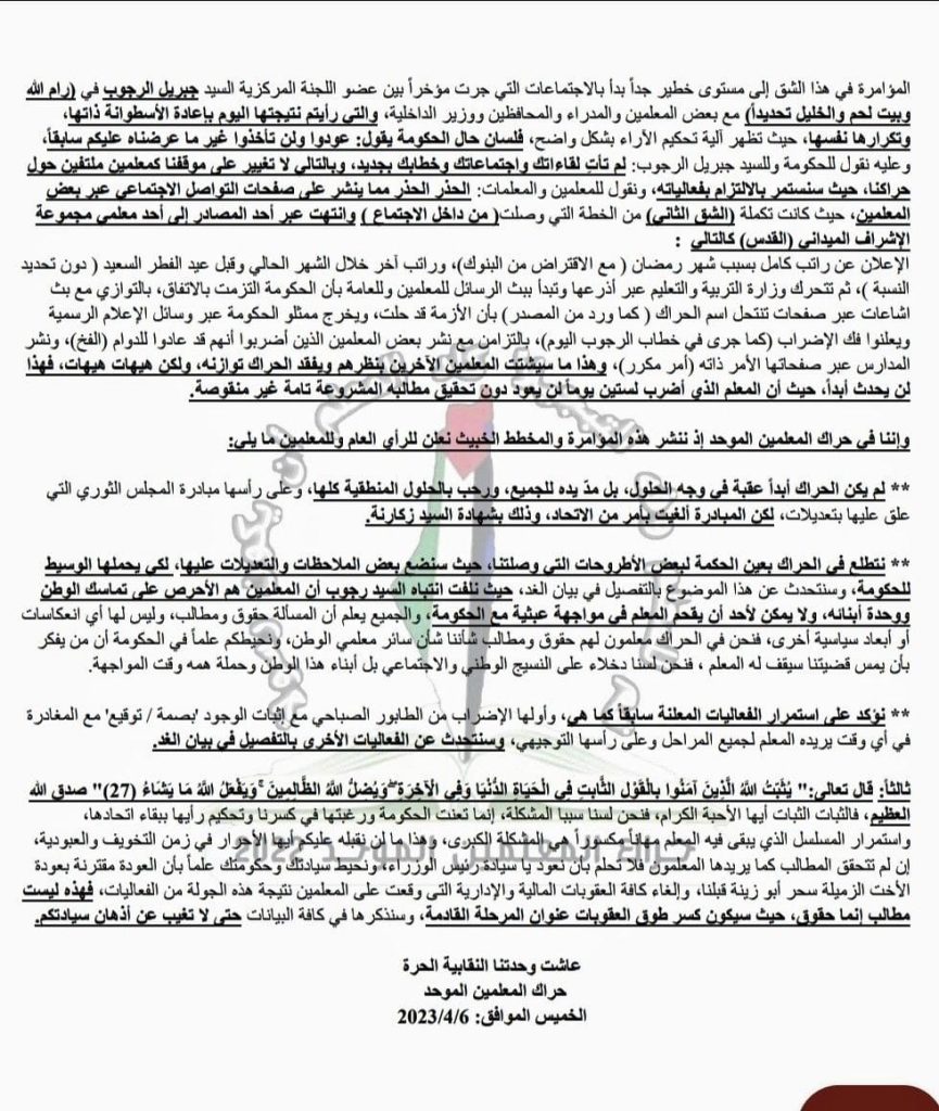 أعلن حراك المعلمين استمرار الإضراب من الطابور الصباحي مع إثبات الوجود عبر البصمة والتوقيع مع المغادرة في أي وقت يريده المعلم لجميع المراحل وعلى رأسها التوجيهي.