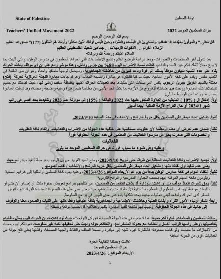 أعلن حراك المعلمين الموحد الليلة، تجميد الإضراب وكافة الفعاليات المُعلنة حتى تاريخ 10 أيلول/سبتمبر المقبل، لمنح الفريق جبريل الرجوب فرصة لتنفيذ مطالب الحراك، وعلى رأسها مطلب تشكيل اتحاد ديمقراطي.