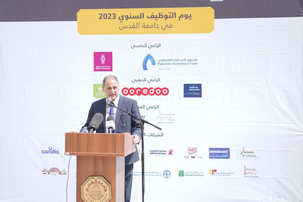 نظمت جامعة القدس فعاليات يوم التوظيف السنوي 2023 تحت رعاية رئيسها أ.د. عماد أبو كشك، برعاية ماسية من صندوق الاستثمار الفلسطيني وبنك فلسطين، ومشاركة بنك القدس وشركة أوريدو وبنك الأردن كرعاة ذهبيين، وشركة بروجينير ومختبرات ميديكير وشركة المشروبات الوطنية كوكاكولا كرعاة فضيين، إلى جانب ثلة من الشركات العريقة في القطاع الخاص.